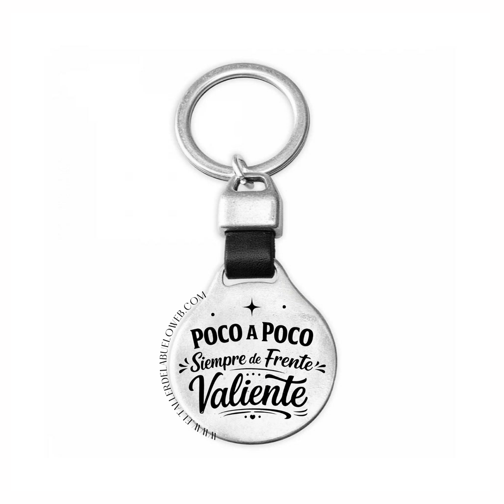 Este llavero cofrade recoge una de las frases más emblemáticas que un capataz dirige a sus costaleros cuando el paso avanza con temple y corazón: “Poco a poco, siempre de frente, valiente”. Un mensaje que resuena bajo la trabajadera y que simboliza unión, esfuerzo y la serenidad del que sabe que cada paso se da con fe.